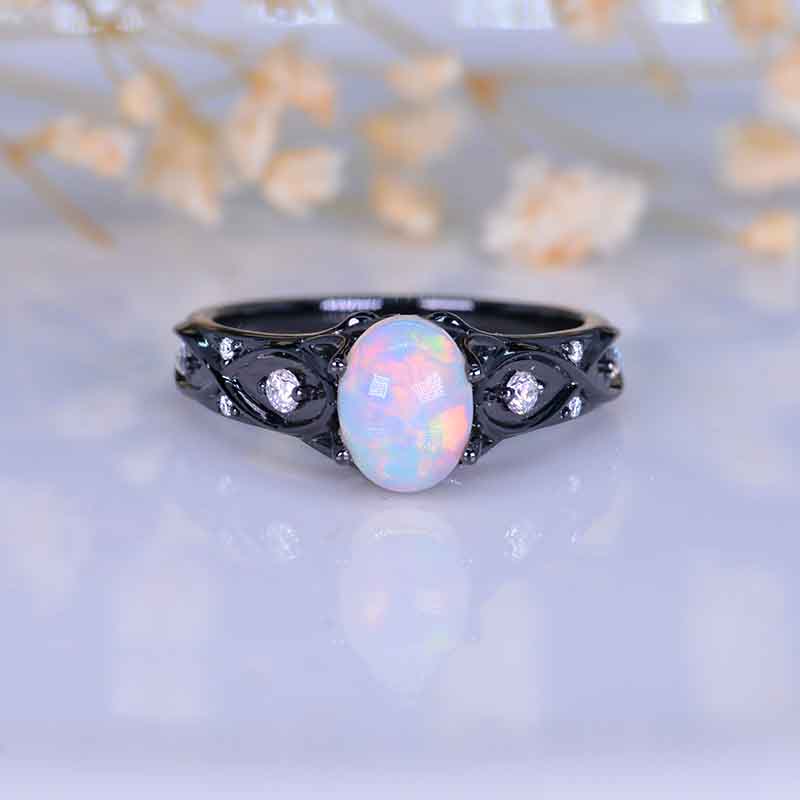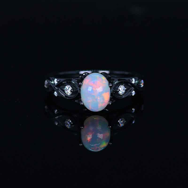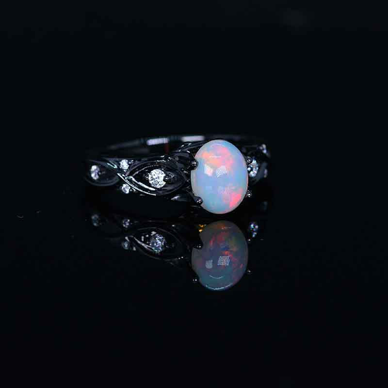 Genuine White Opal Center Stone - Oval 8x6mm Ex-Cut, Ex-Polish, VG-Symmetry and 8 Moissanite D-Colorless Accents  0.1 CTW with 14K Black Gold or Black Platinum. Black Rhodium Plated.