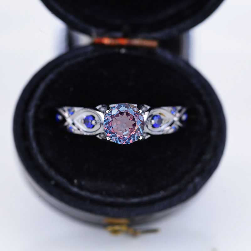 Portuguese Cut Ethically Lab-Grown Alexandrite Center Stone-Round 6mm, Ex-Cut, Ex-Polish, VG-Symmetry) and 8- Royal Blue Sapphire Accents 0.1 CTW with Black Silver/14K Gold/ Platinum PT900 Coated with Black Rhodium. Engagement Ring Only.
