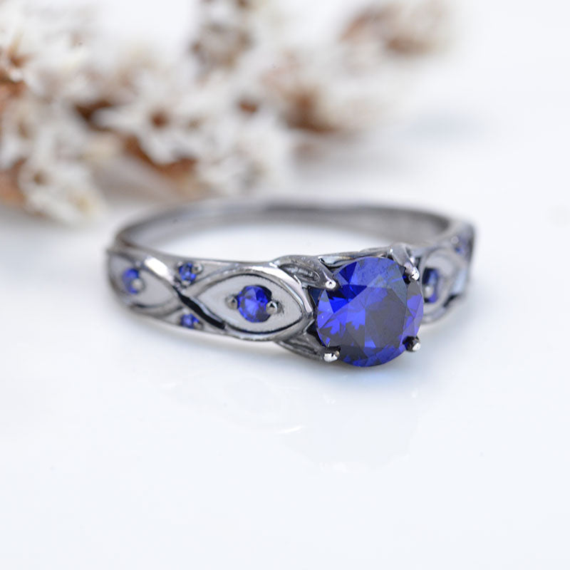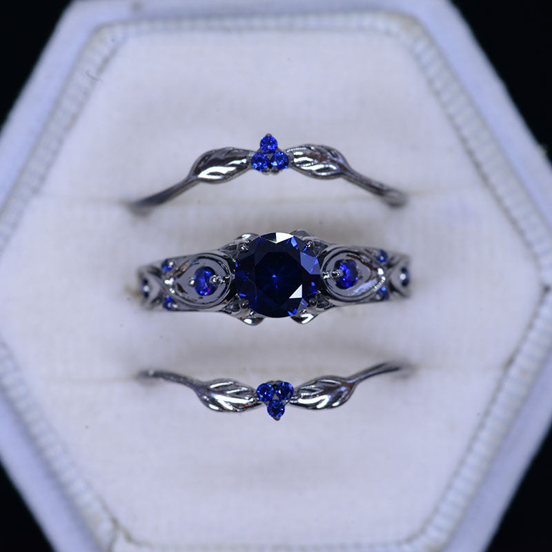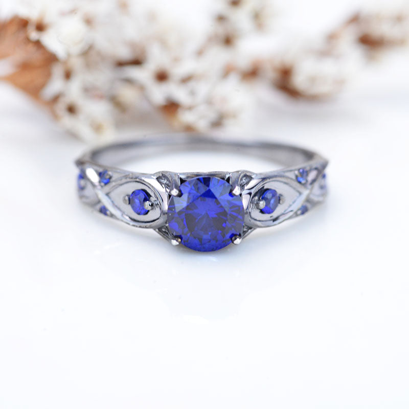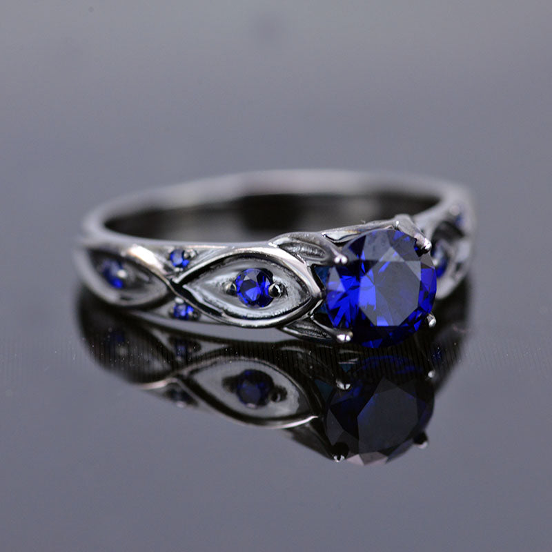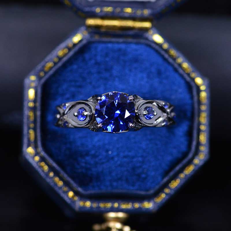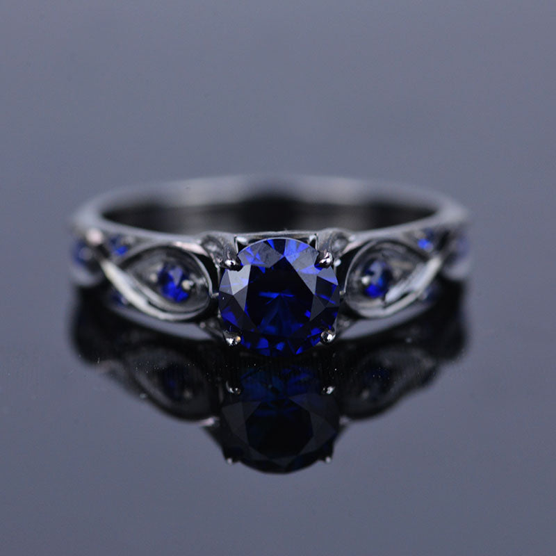 Royal Blue Sapphire Center Stone-Round 6mm, Ethically Lab-Grown VVS1-Clarity, Ex-Cut, Ex-Polish, VG-Symmetry) and 8-Sapphire Accents 0.1 CTW with 14K Black Gold with Black Platinum.