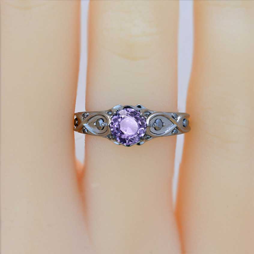 Ethically LAB-Grown Purple Sapphire Center Stone - Round 6 mm, VVS1-Clarity, Ex-Cut, Ex-Polish, VG-Symmetry and 8 - Black Moissanite Accents 0.1 CTW with 14K Black Gold or Black Platinum.