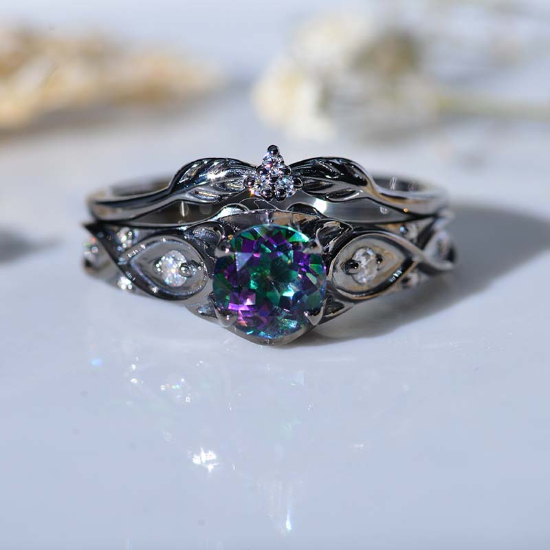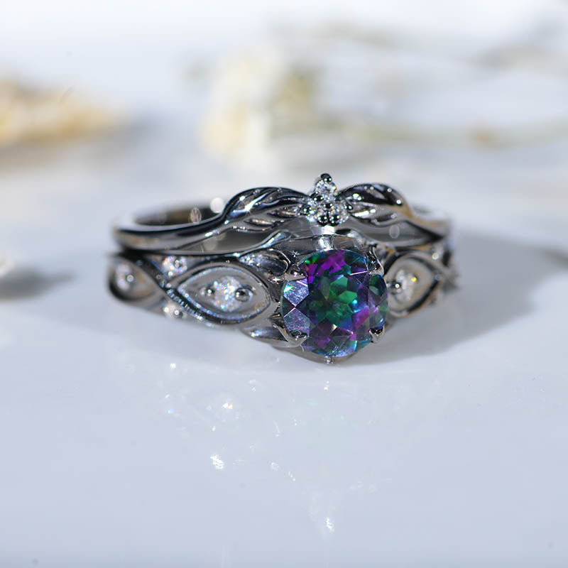 14K Black Gold Silver Mystic Topaz Celtic Engagement Ring Set - Giliarto