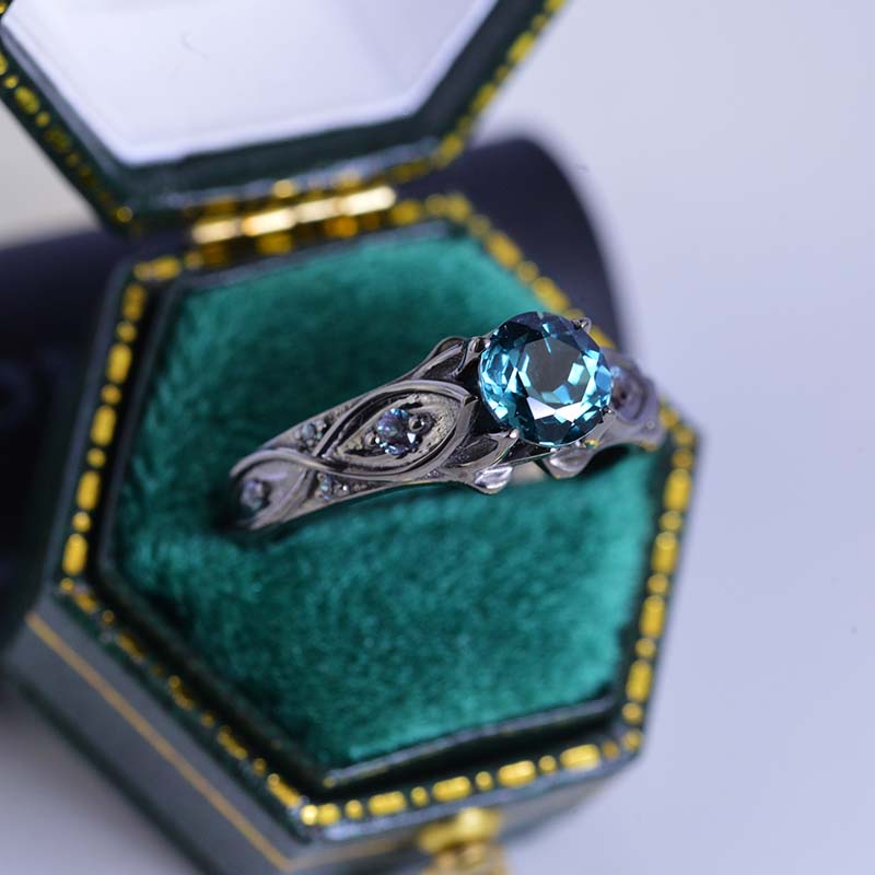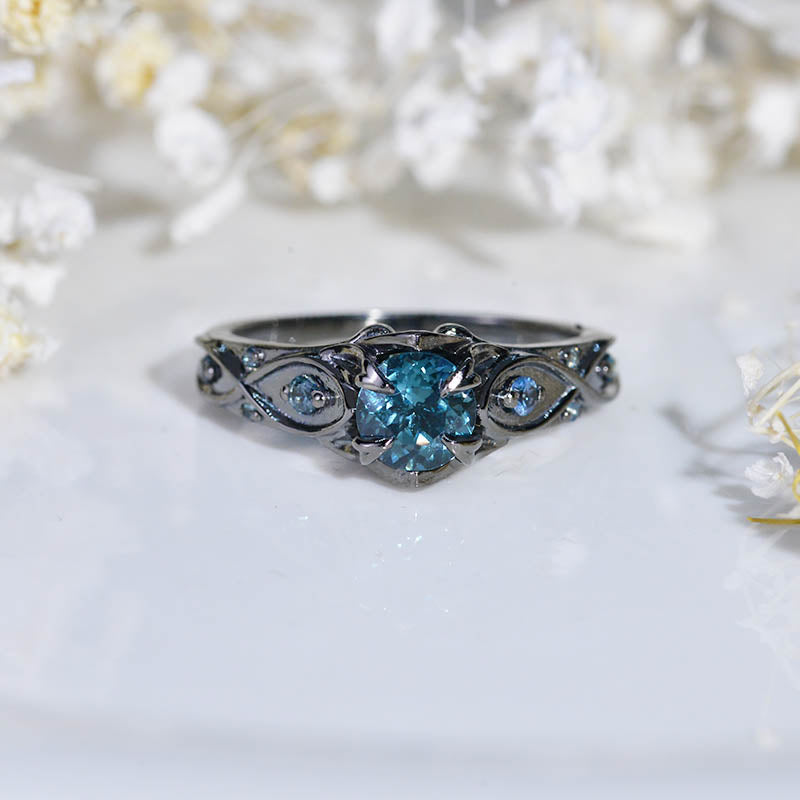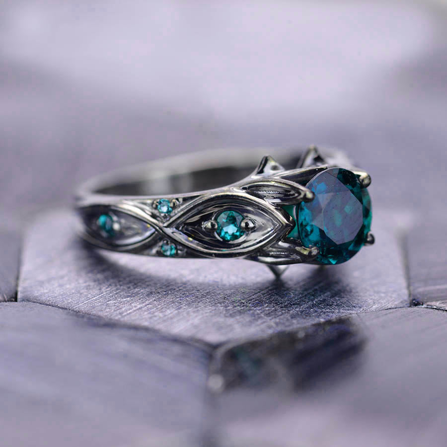 Teal Sapphire Center Stone - Round 6 mm, Ethically Lab-Grown, AAA+ Grade VVS1-Clarity, Ex-Cut, Ex-Polish, VG-Symmetry and 8-Accents  0.1 CTW with 14K Black Gold or Black Platinum. Black Rhodium Plated. Please review the care instructions.