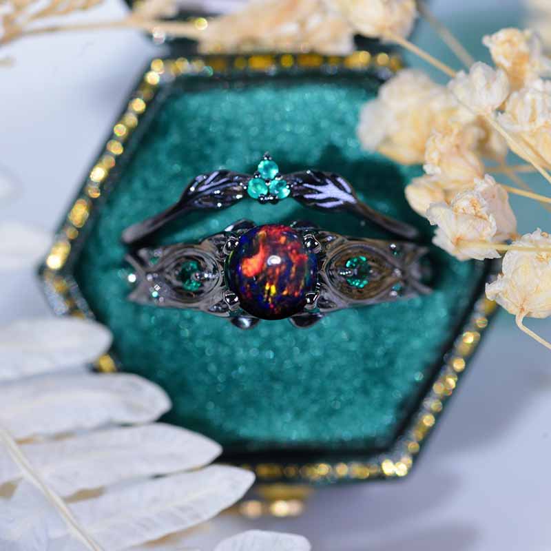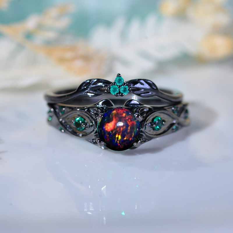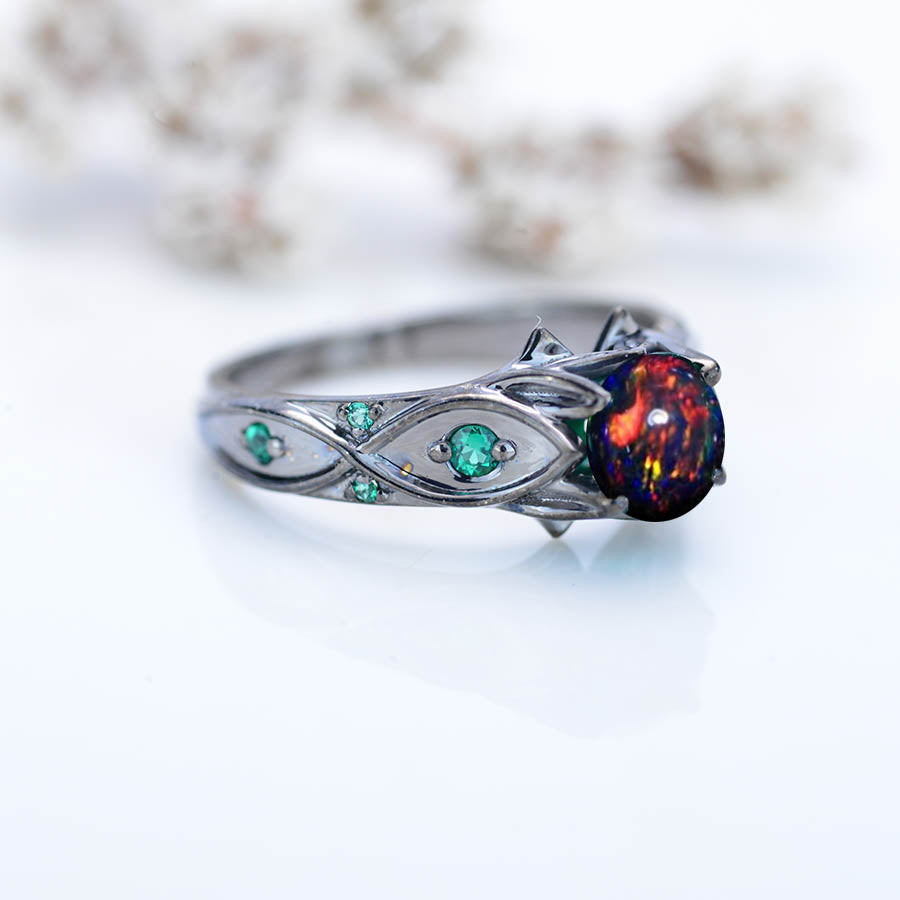 AAA Grade Natural Black Fire Opal Center Stone - Round 6mm Cabochon Cut, and - Emerald Accents 0.1 CTW set in 14K Gold with Black Rhodium Coating.