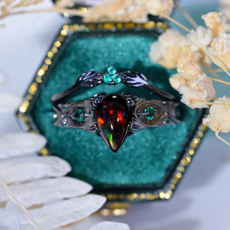 AAA Grade Natural Black Fire Opal Center Stone - Pear 6x8mm Cabochon Cut, and Black Fire Opal Accents 0.1 CTW set in 14K Gold/PT900 Platinum with Black Rhodium Coating.