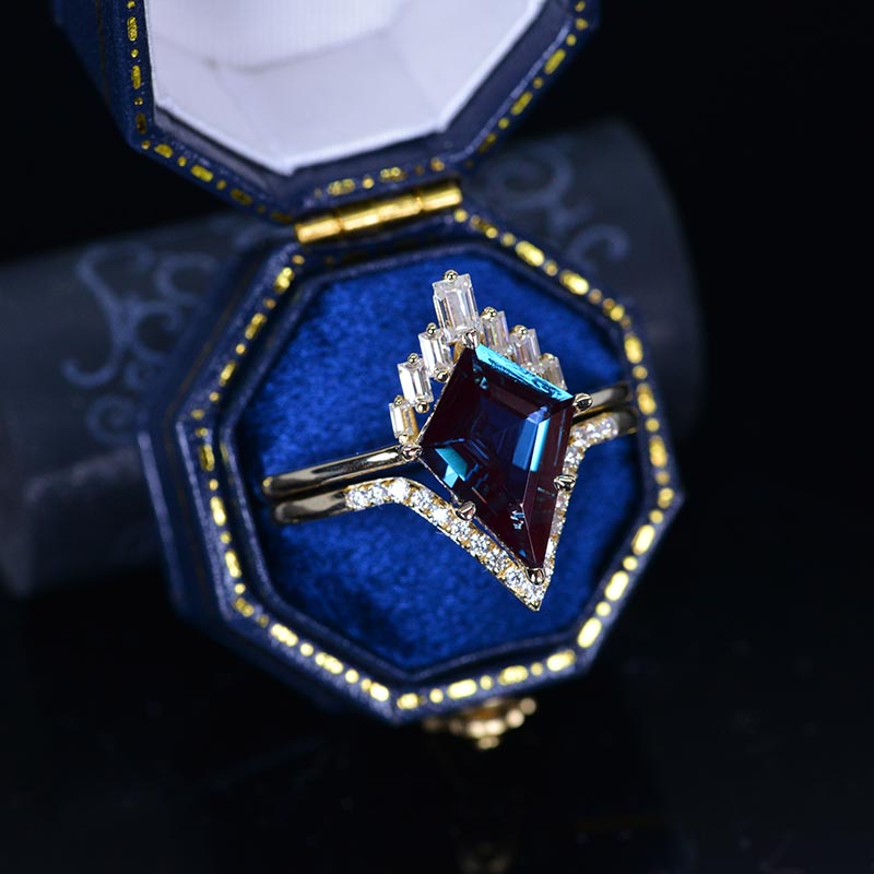 14K Gold 4 Carat Kite Alexandrite Halo Engagement Ring, Eternity Ring Set