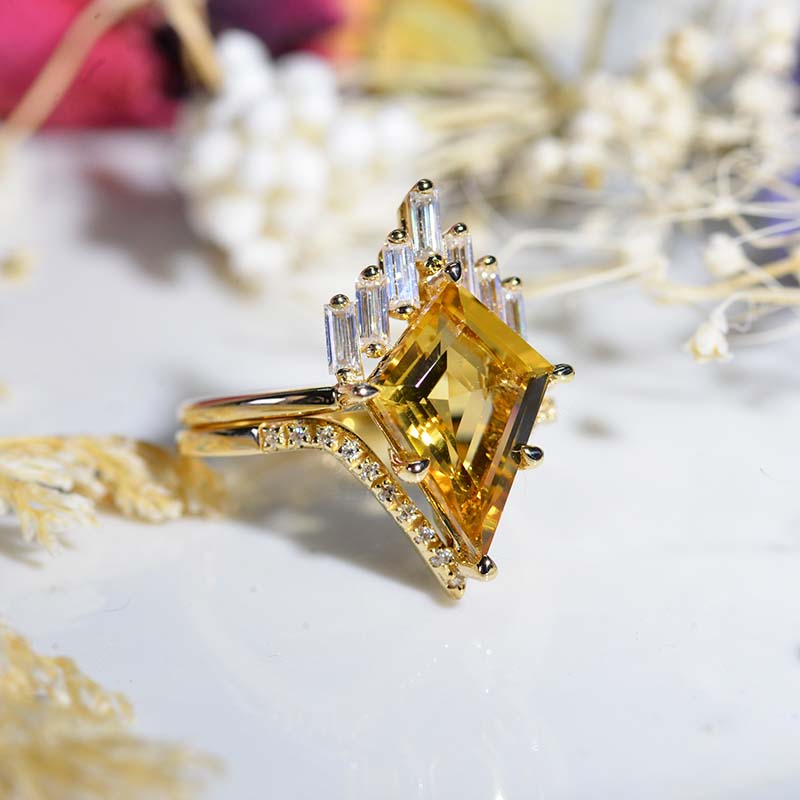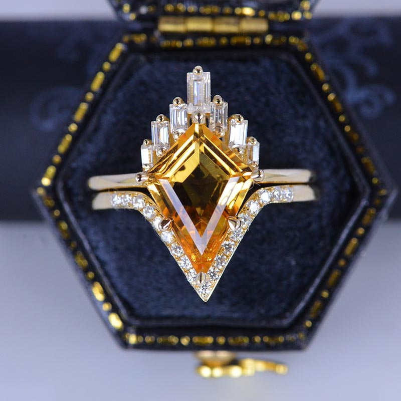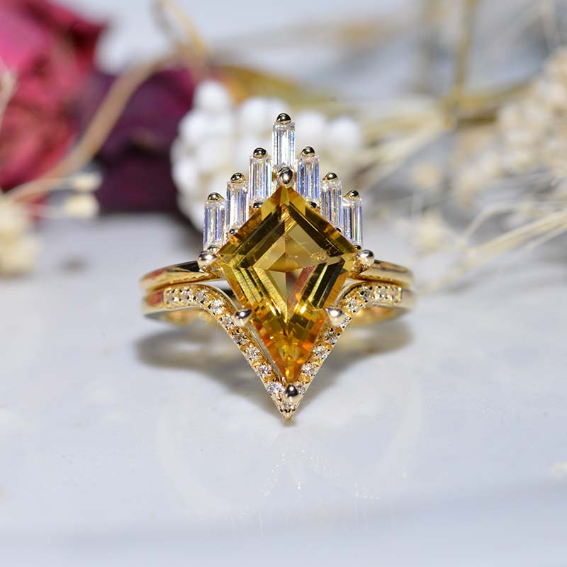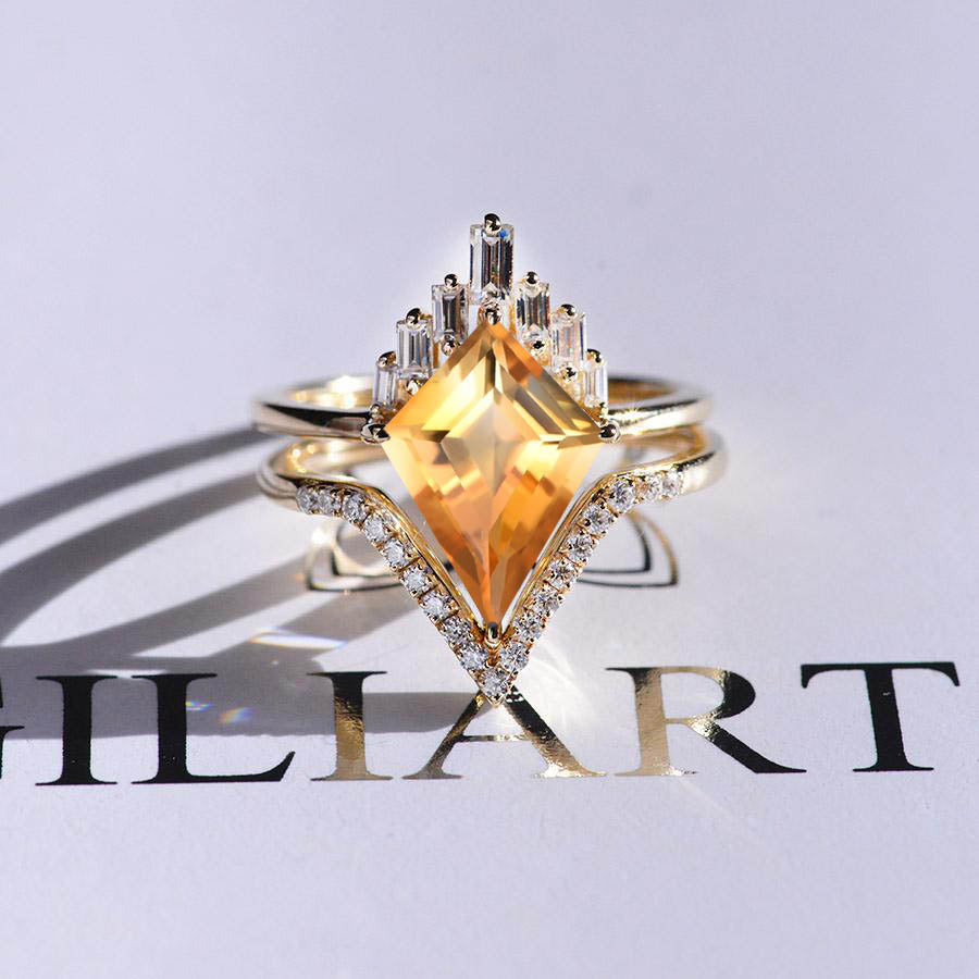 14K Gold 4 Carat Kite Citrine Halo Engagement Ring, Eternity Ring Set - Giliarto