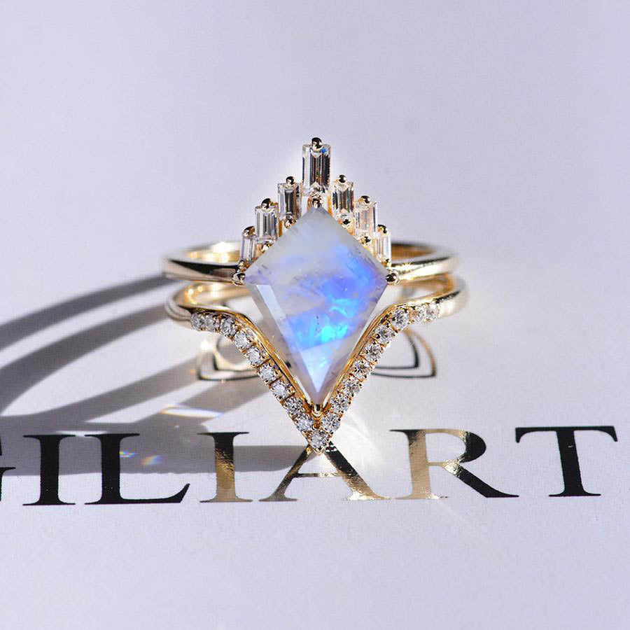 14K Gold 4 Carat Kite Genuine Moonstone Halo Engagement Ring, Eternity Ring Set