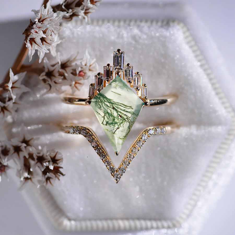14K Gold 4 Carat Kite Genuine Moss Agate Halo Engagement Ring, Eternity Ring Set 416-14x10mm Kite