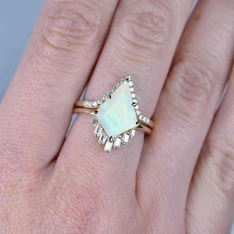 14K Gold 4 Carat Kite Genuine White Opal Halo Unique Engagement Ring, Eternity Ring Set