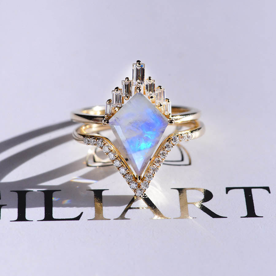 14K Gold 4 Carat Kite Moonstone Halo Engagement Ring, Eternity Ring Se - Giliarto