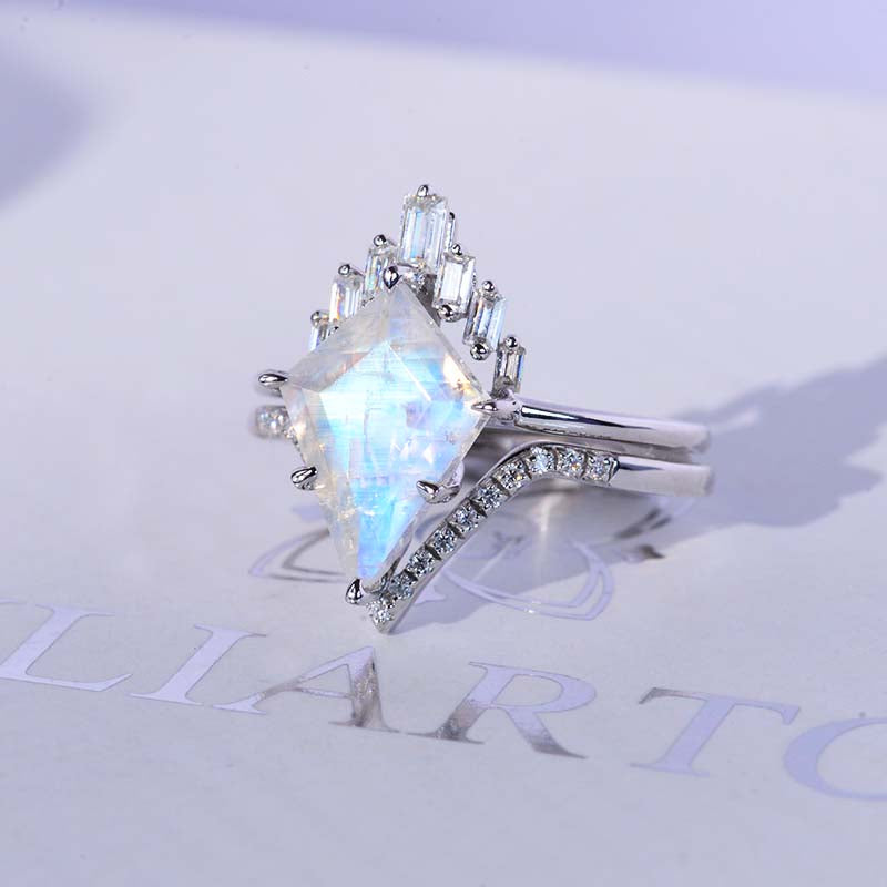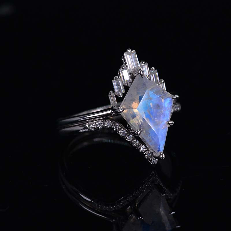 14K Gold 4 Carat Kite Moonstone Halo Engagement Ring, Eternity Ring Set