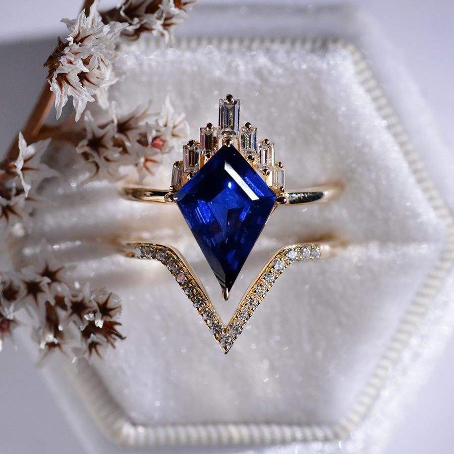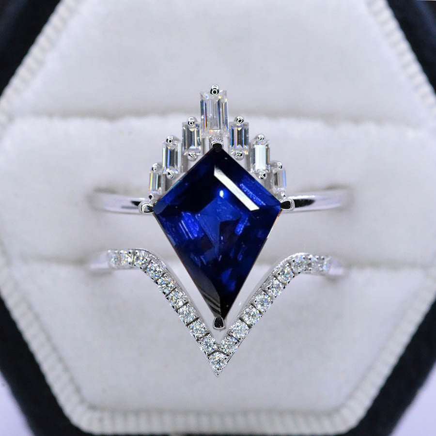Engagement : 4 Carat Ethically Lab-Grown Royal Blue Sapphire Kite 14x10 mm VVS1-Clarity, VG-Cut, Ex-Polish, VG-Symmetry Center Stone with 38 Colorless 0.5 CTW Moissanite