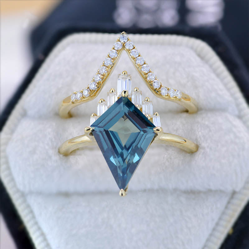 14K Gold 4 Carat Kite Teal Sapphire Halo Engagement Ring, Eternity Ring Set