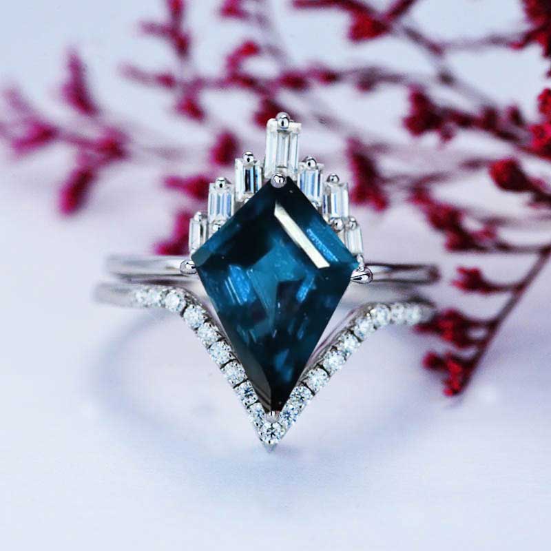 14K Gold 5 Carat Kite Cornflower Sapphire Halo Engagement Ring, Eternity Ring Set