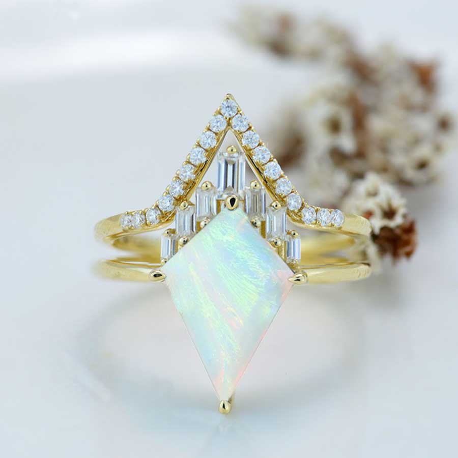 14K Gold 5 Carat Kite Genuine White Opal Halo Engagement Ring, Eternity Ring Set