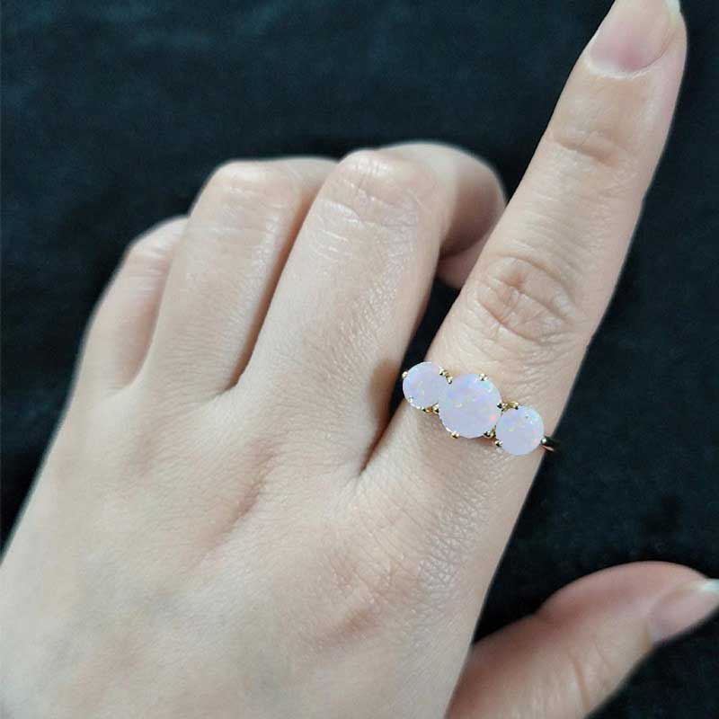 14K Gold Classic Round Three Stone White Opal Ring, Luxury Engagement - Giliarto