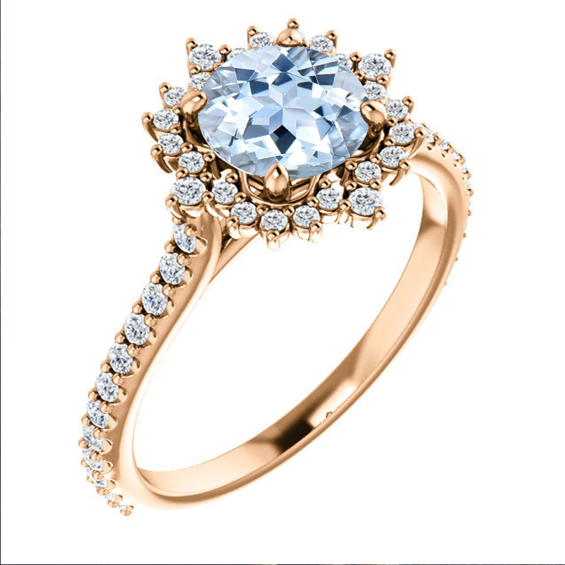 14K Gold Genuine Natural Aquamarine Round 1/3 CTW Diamond Engagement Ring
