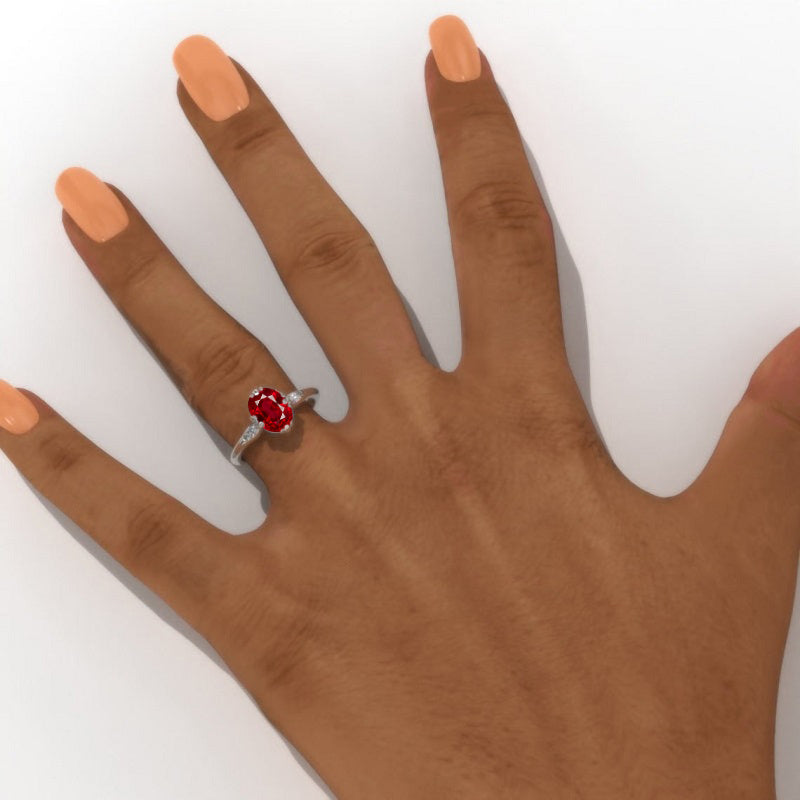 The default design option features 9x7mm Oval Ethically Lab-Grown Ruby AAA+ Grade Center Stone VG-Cut, Ex-Polish, VG-Symmetry set with D- Colorless Moissanite Accent Stones