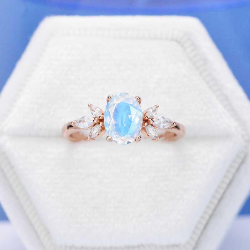 Engagement: 1.5 Carat  Genuine Moonstone Oval 8x6mm VVS1-Clarity, VG-Cut, Ex-Polish, VG-Symmetry Center Stone with Colorless 0.6 CTW Moissanite
