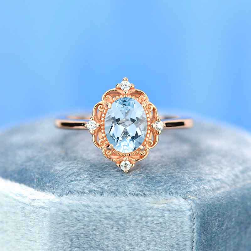 14K Rose Gold 1.5 Carat Oval Genuine Natural Aquamarine Halo Engagemen - Giliarto