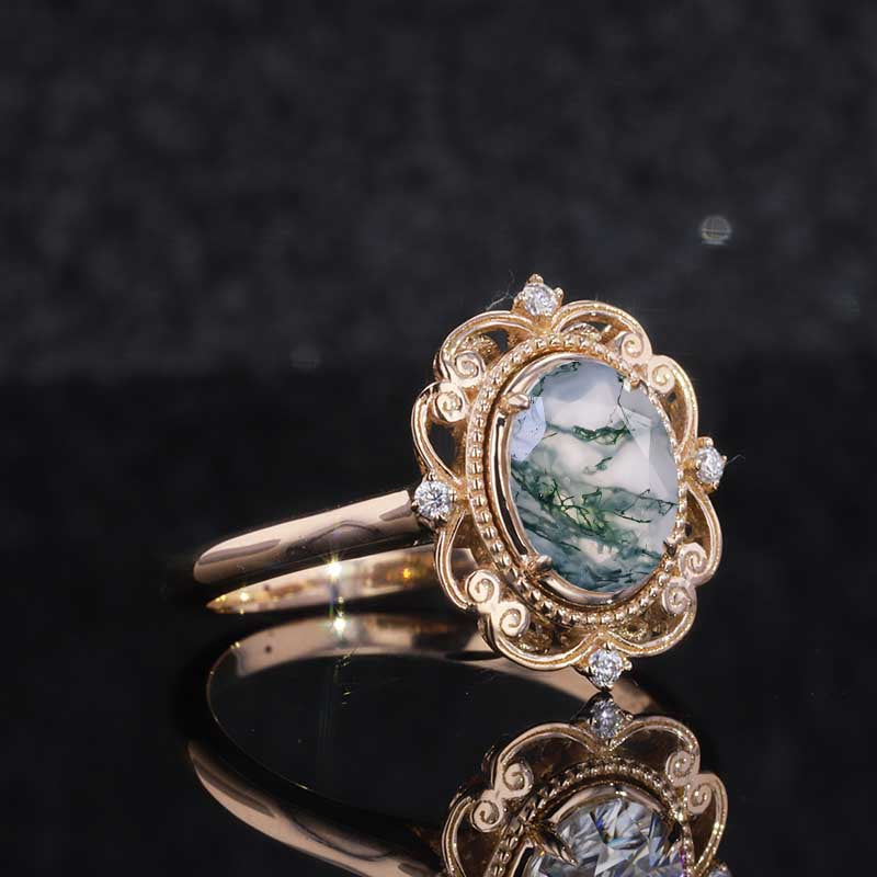 14K Rose Gold 2 Carat Oval Genuine Moss Agate Halo Vintage Engagement Ring Model 538