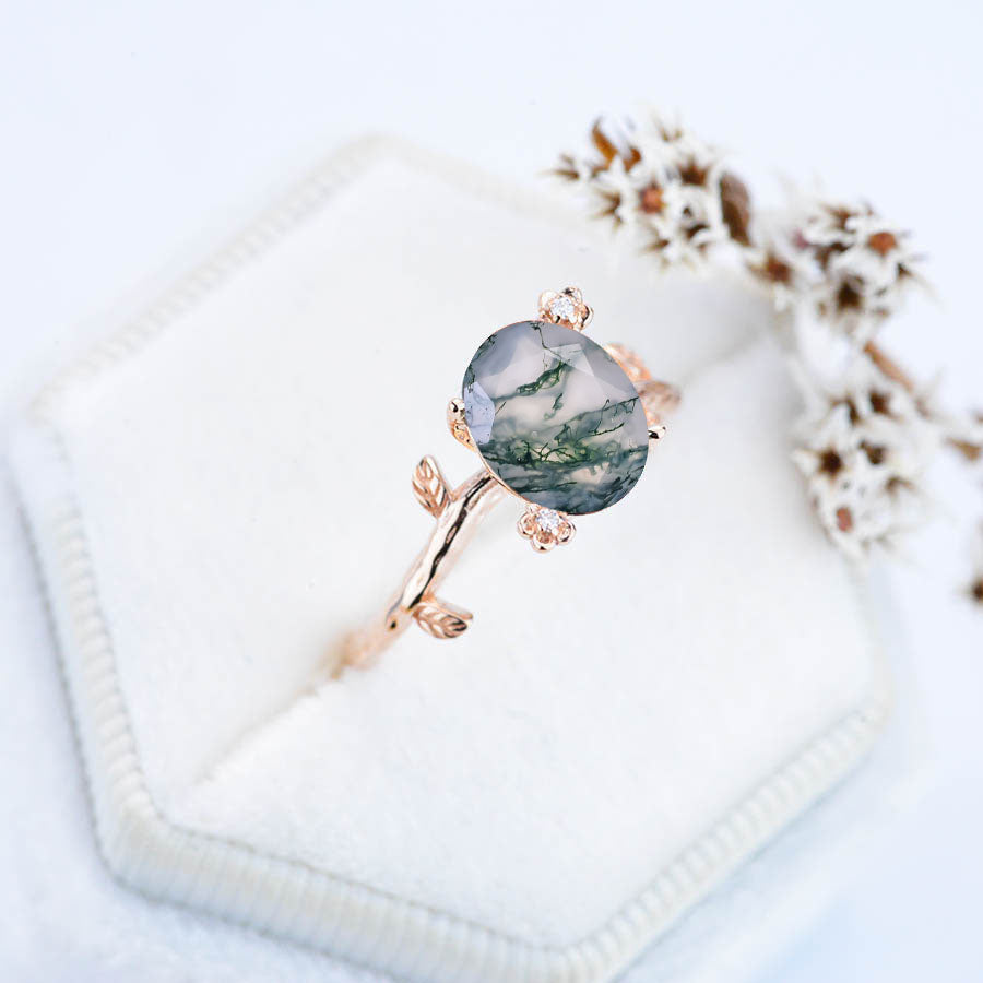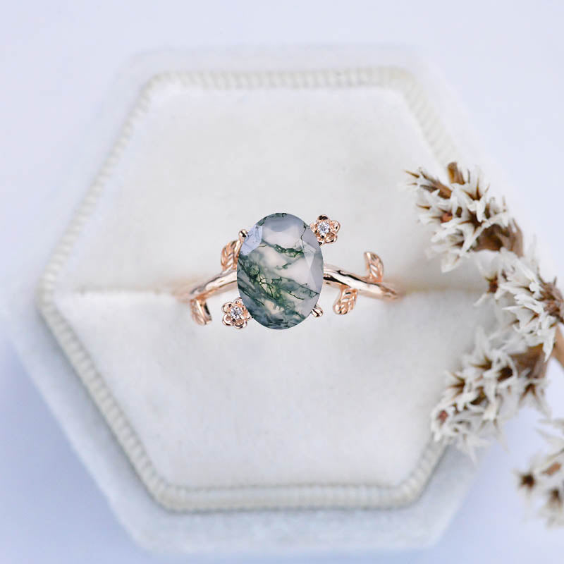 The default design option features 9x7mm Oval Cut Genuine Moss Agate