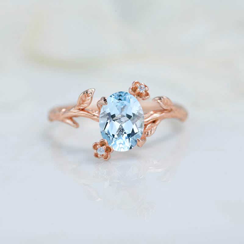 14K Rose Gold Dainty Genuine Natural Aquamarine Leaf Ring, 2ct Oval Ge - Giliarto