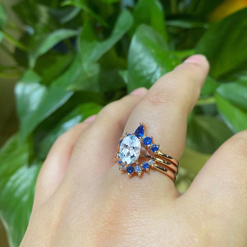 14K Rose Gold Dainty Genuine Natural Aquamarine Ring Set, 2ct Oval Cut Genuine Natural Aquamarine Ring Set, Rose Gold Ring Unique Curved Vintage Ring Set