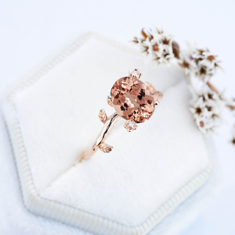 The default design option features 9x7mm Oval Cut Peach Morganite