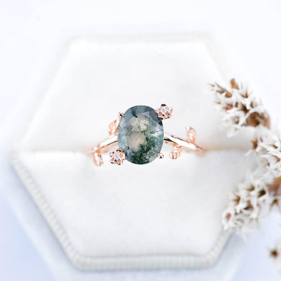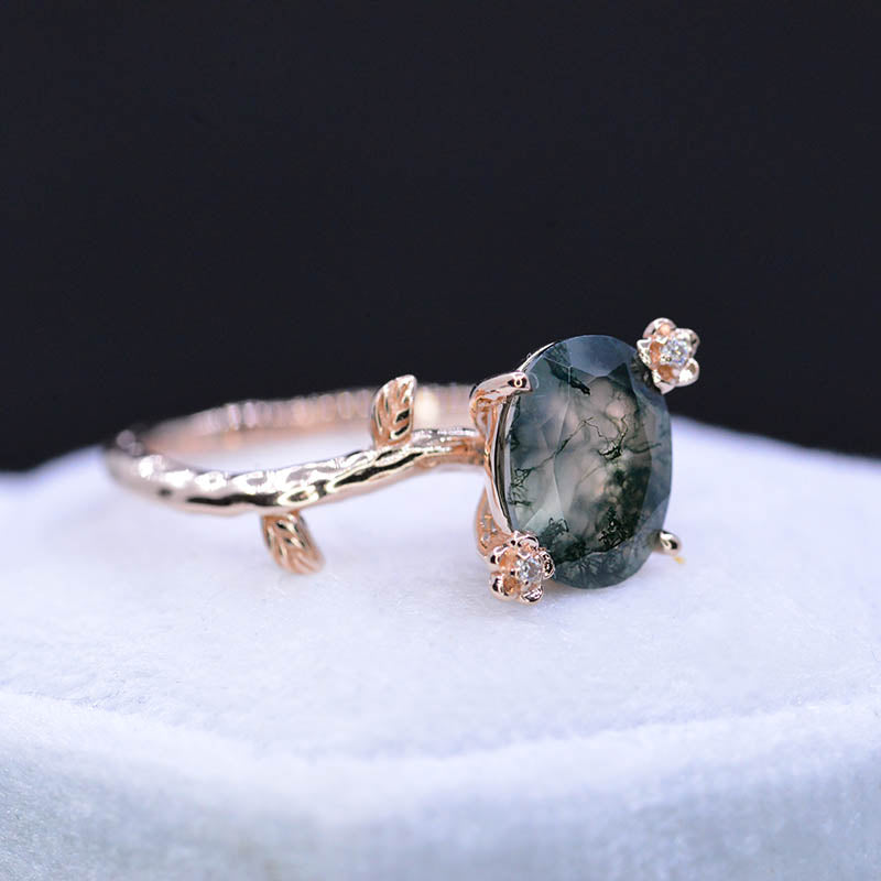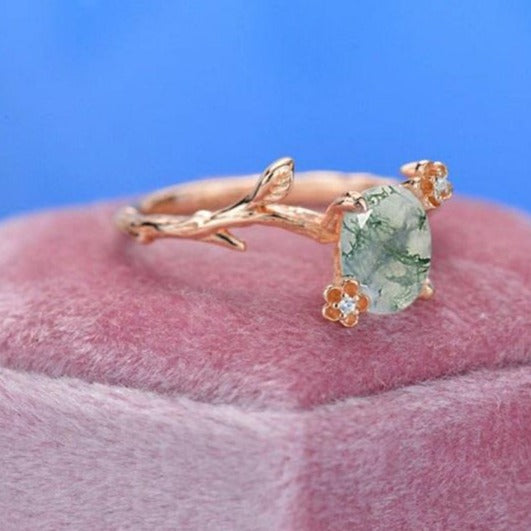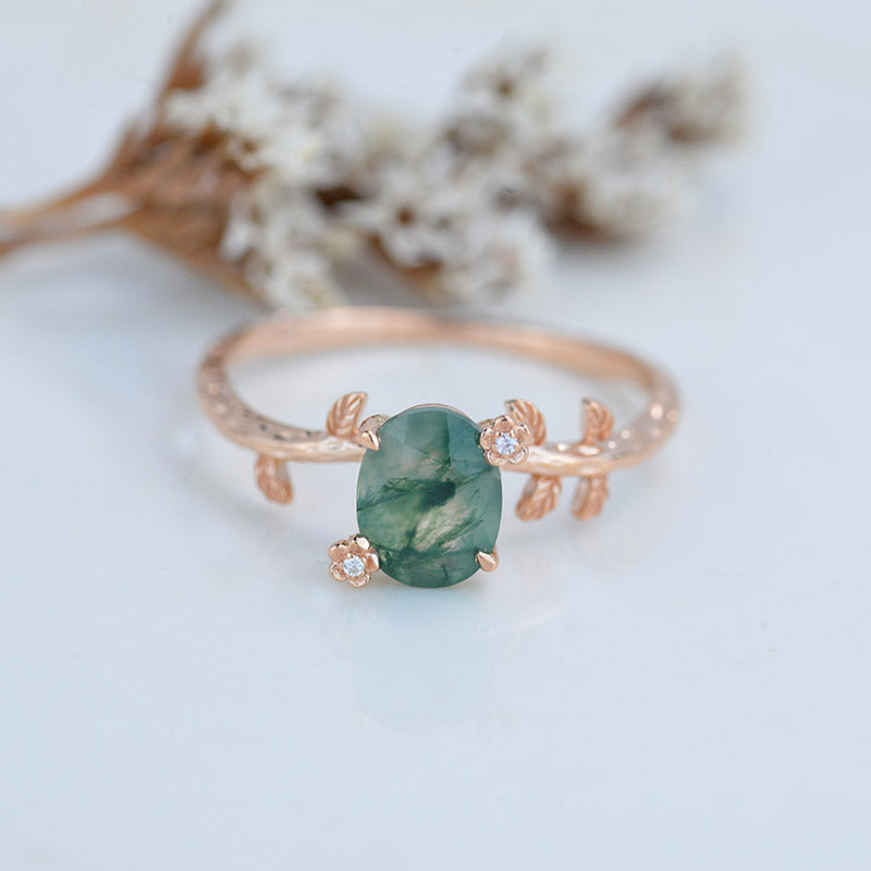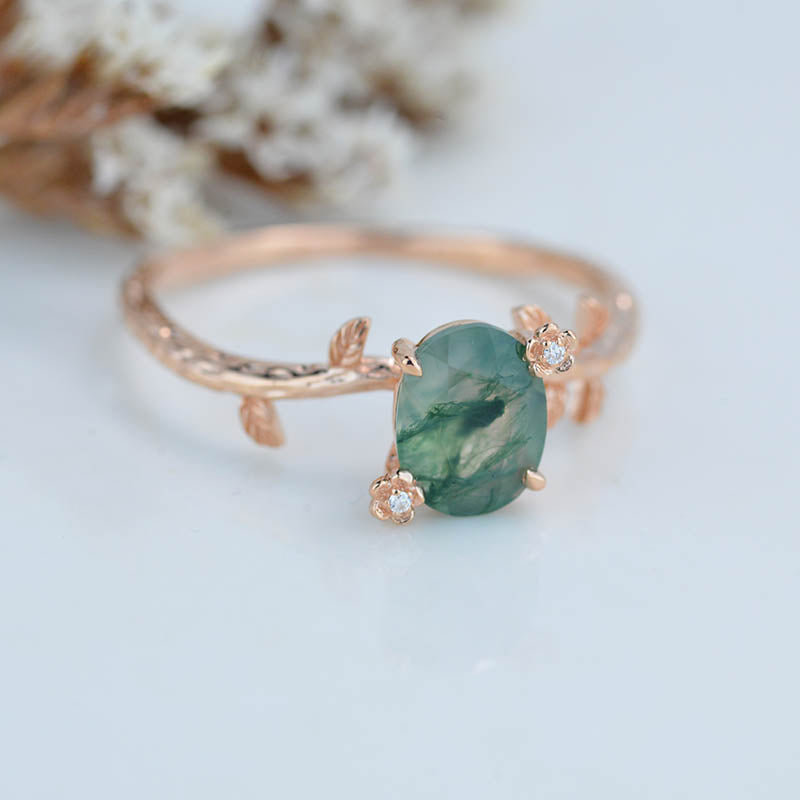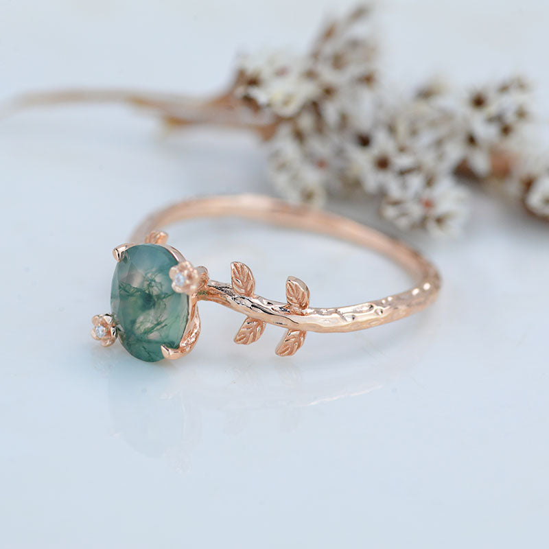 14K Rose Gold Dainty Natural Moss Agate Leaf Ring, 2ct Oval Agate Twig - Giliarto