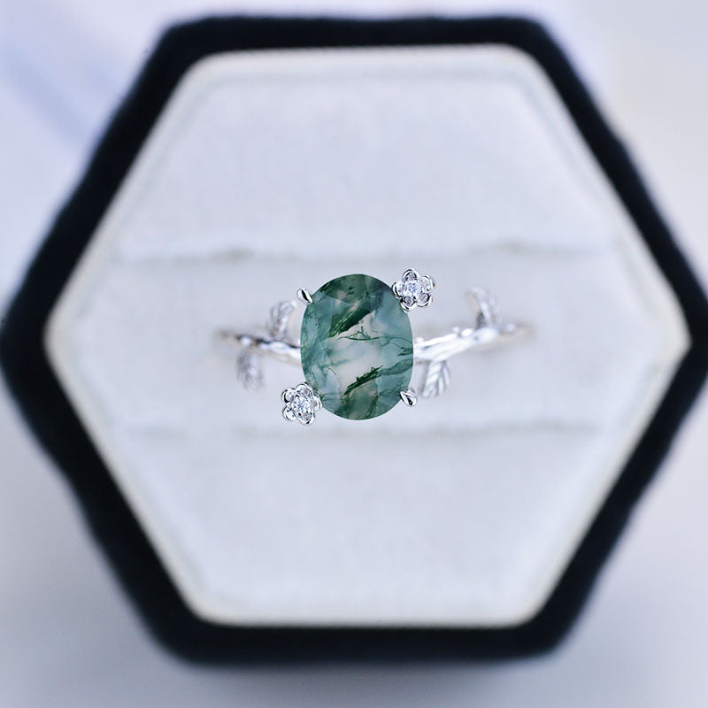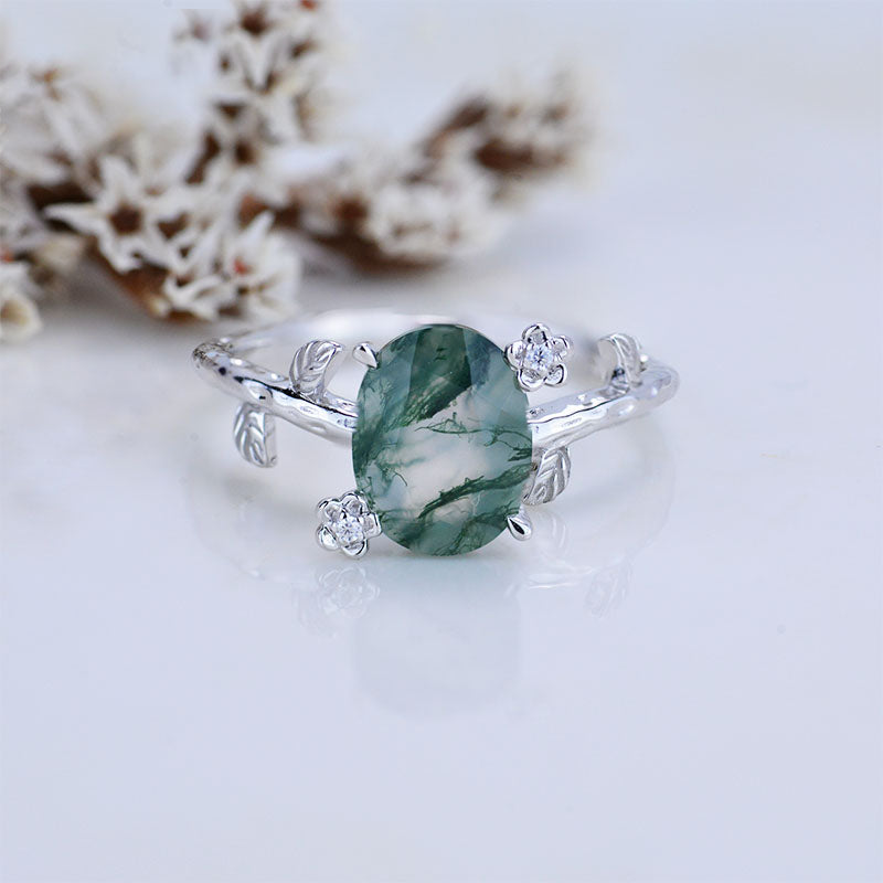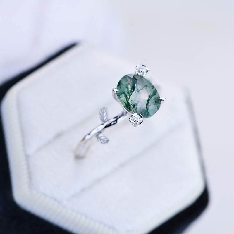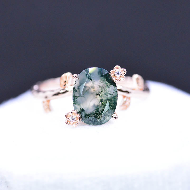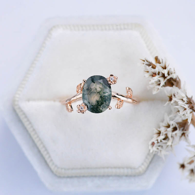 14K Rose Gold Dainty Natural Moss Agate Leaf Ring, 2ct Oval Agate Twig - Giliarto