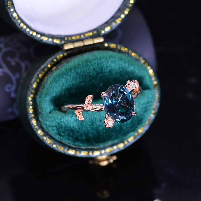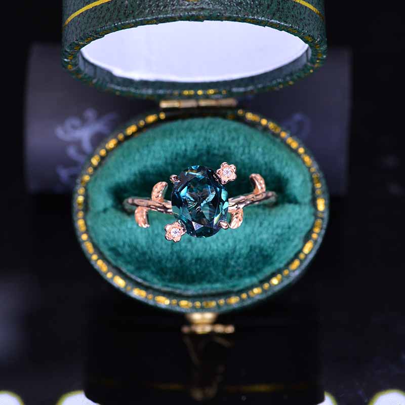 14K Rose Gold Dainty 2 Carat Oval Teal Sapphire Floral Ring - Giliarto