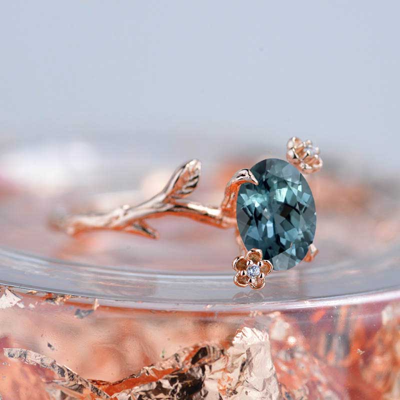 14K Rose Gold Dainty Teal Sapphire Leaf Ring, 2ct Oval Teal Sapphire T - Giliarto