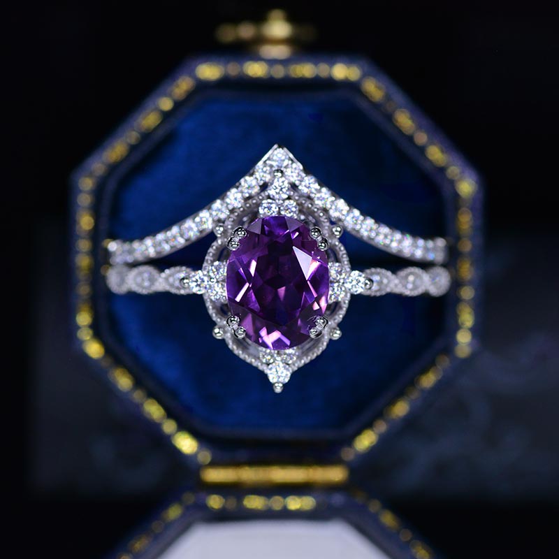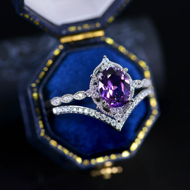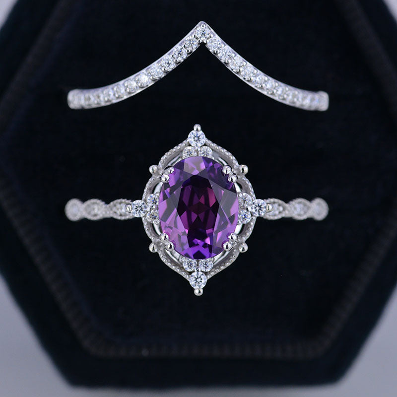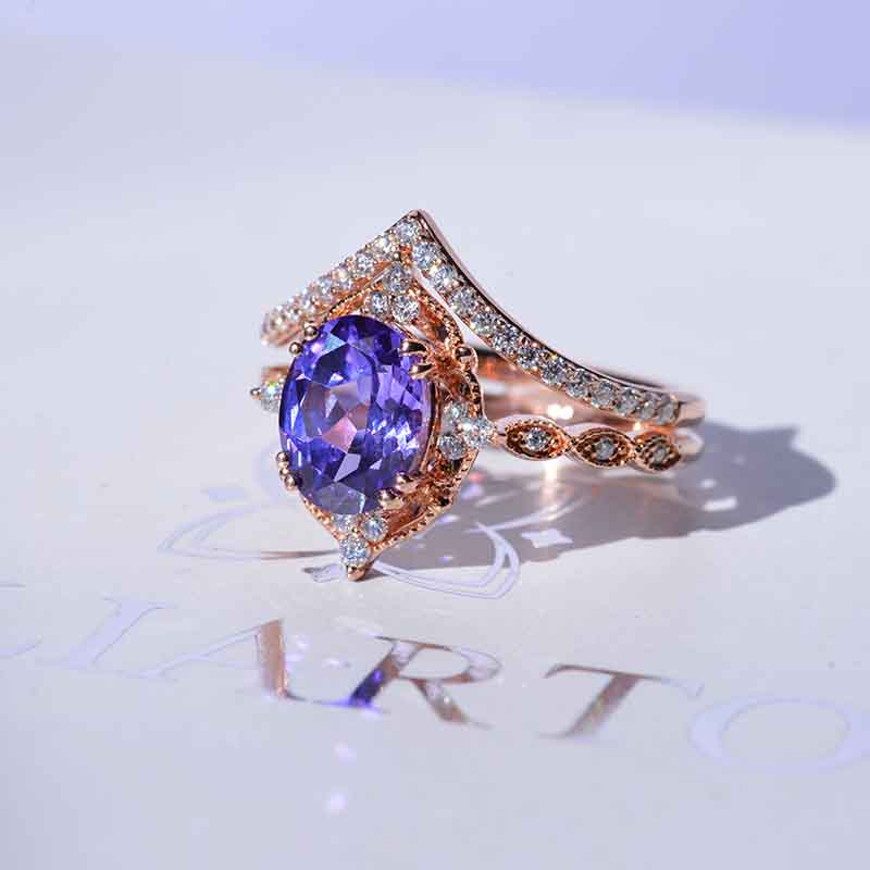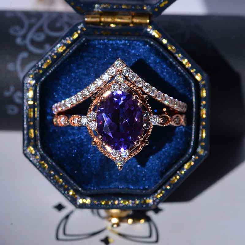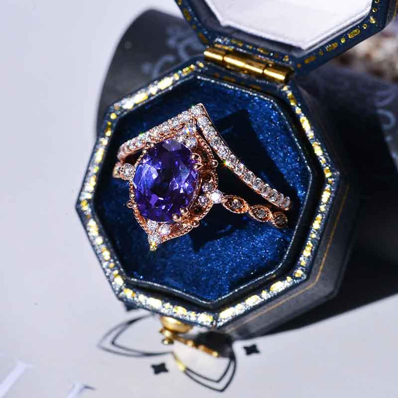 14K Rose Gold Ring 2CT Oval Vintage Wedding Ring, Oval Lavender Sapphire Halo Engagement Ring Set