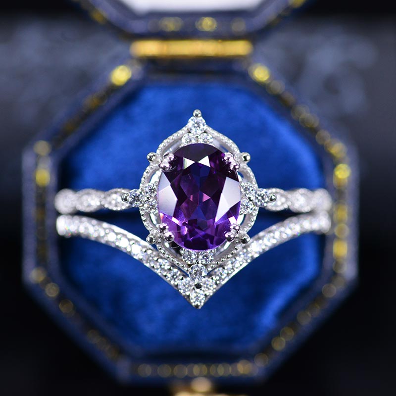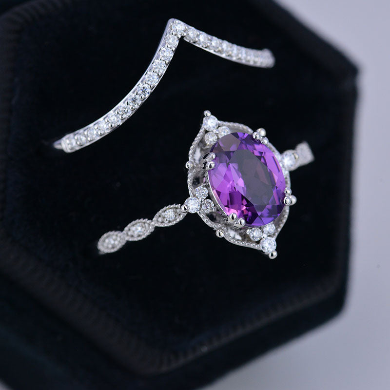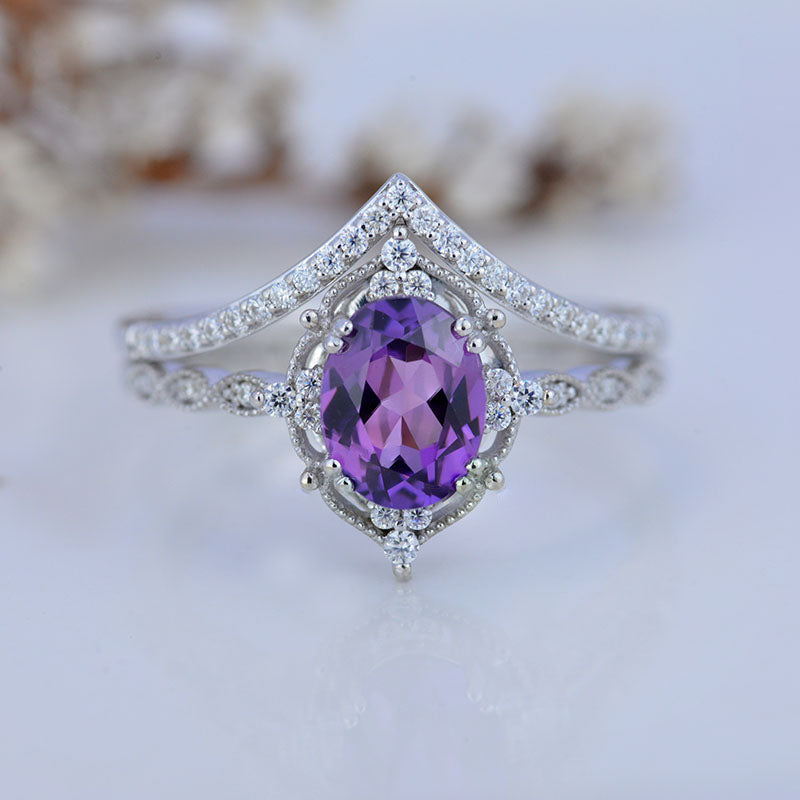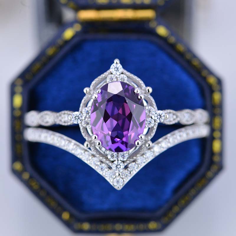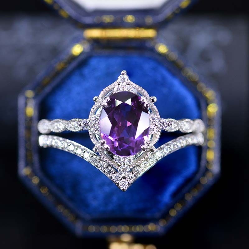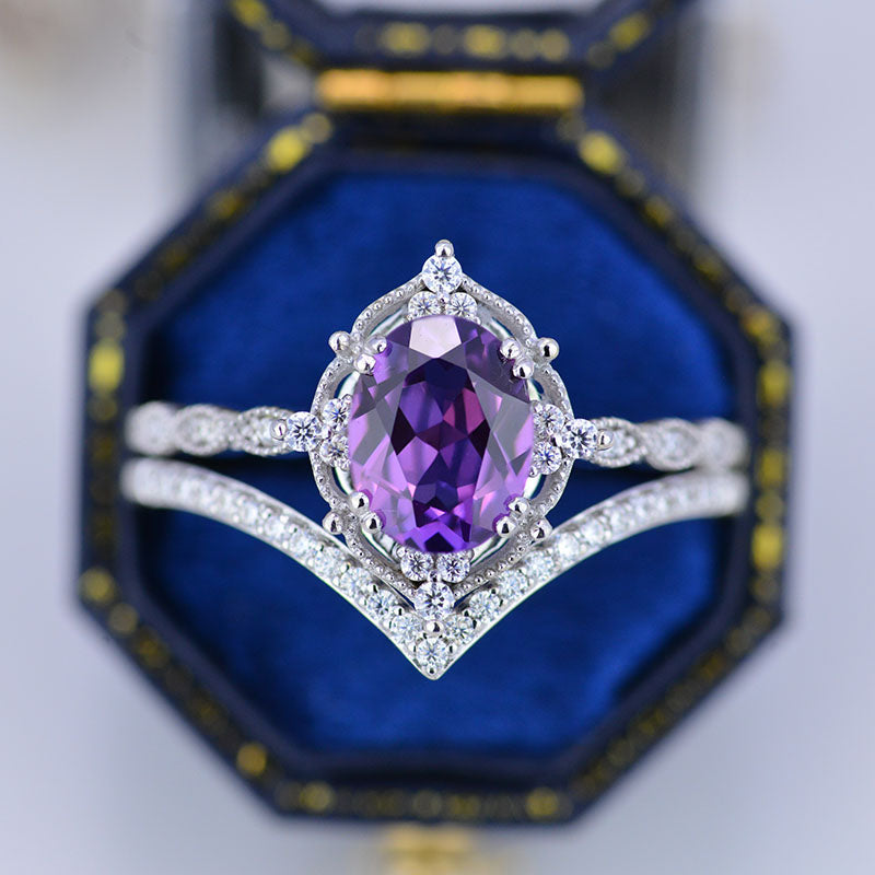14K Rose Gold Ring 2CT Oval Vintage Wedding Ring, Oval Lavender Sapphire Halo Engagement Ring Set