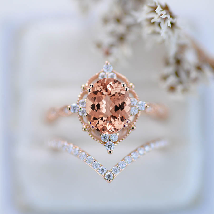 The default design option features 9x7mm Oval Natural Peach Morganite Stone, VVS1-Clarity, VG-Cut, Ex-Polish, VG-Symmetry set with D-Colorless Diamond Accents