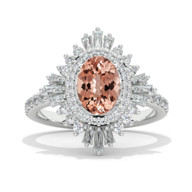 The default design option features 1.5 Carat Genuine Peach Morganite 8x6mm Oval Center StoneVVS1-Clarity, VG-Cut, Ex-Polish, VG-Symmetry