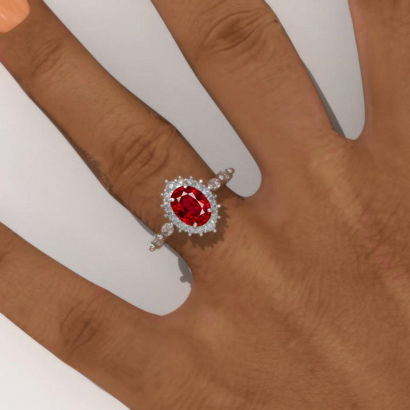 The default design option features 8x6mm Oval Center Stone Ethically Lab-Grown Ruby AAA+ Grade StoneVG-Cut, Ex-Polish, VG-Symmetry set with D- Colorless Moissanite Accent Stones