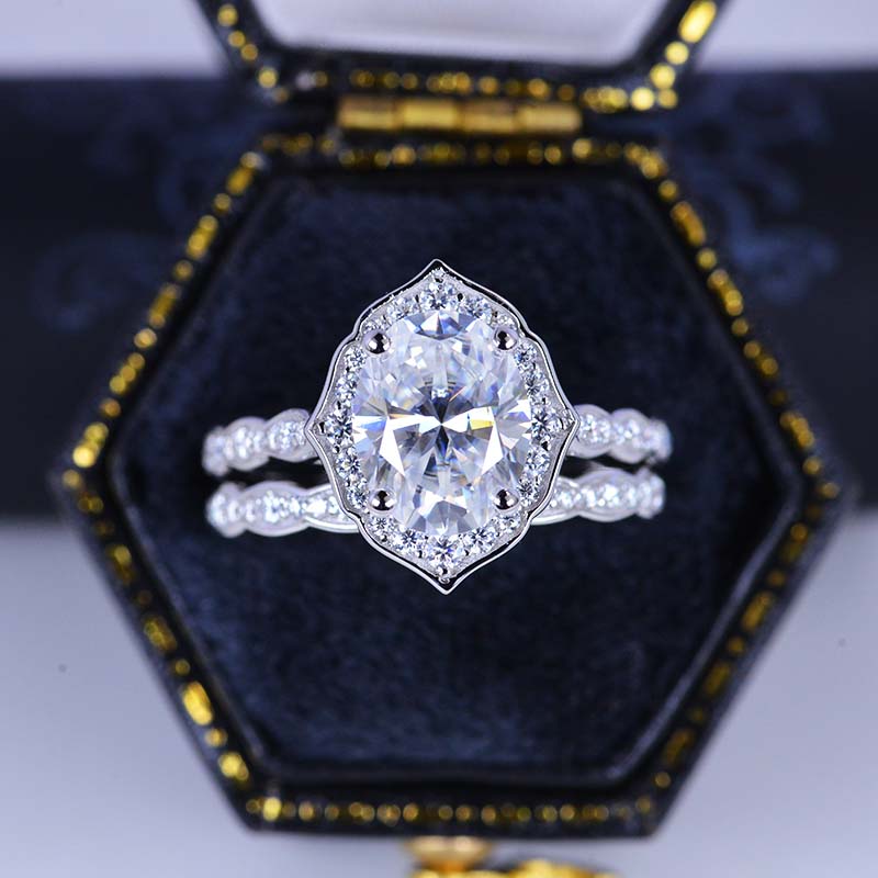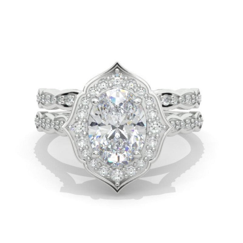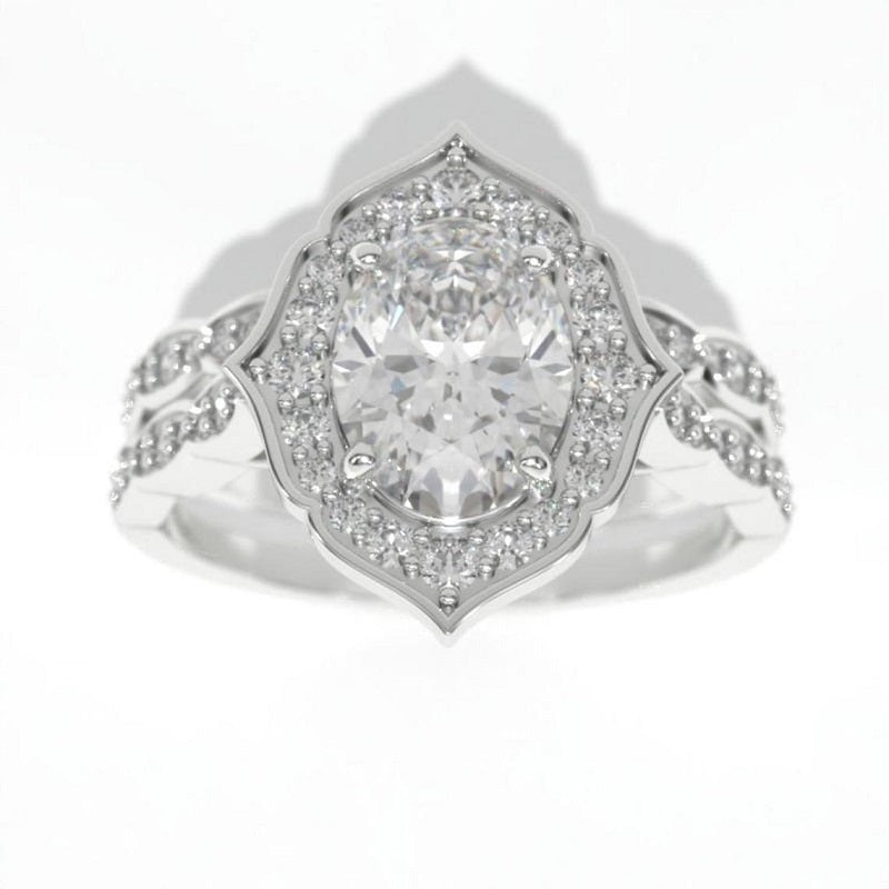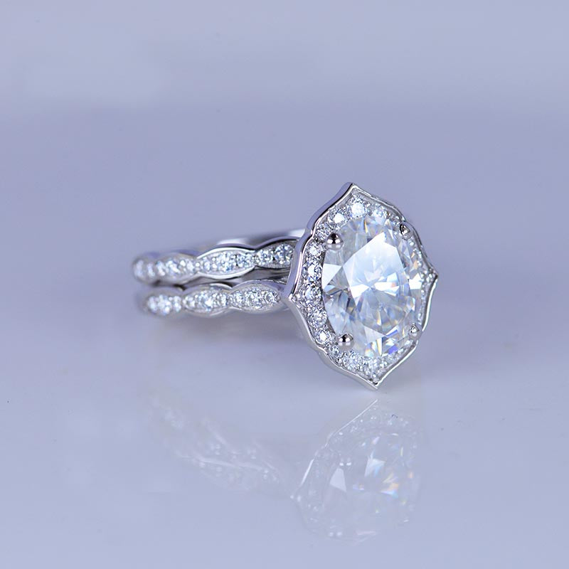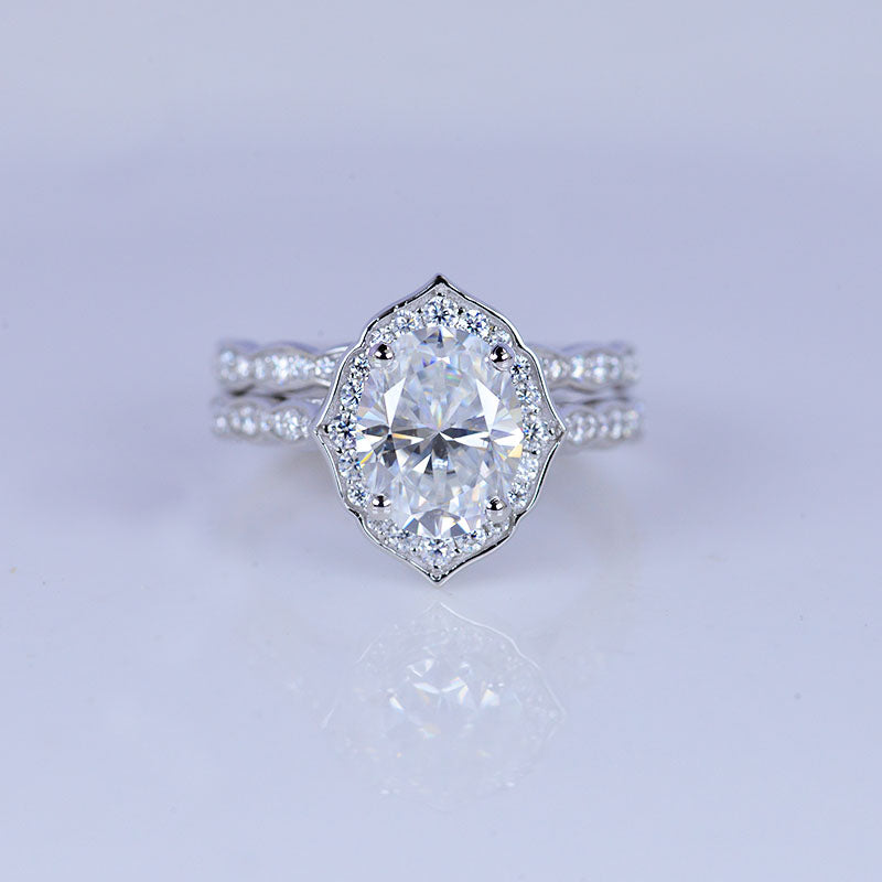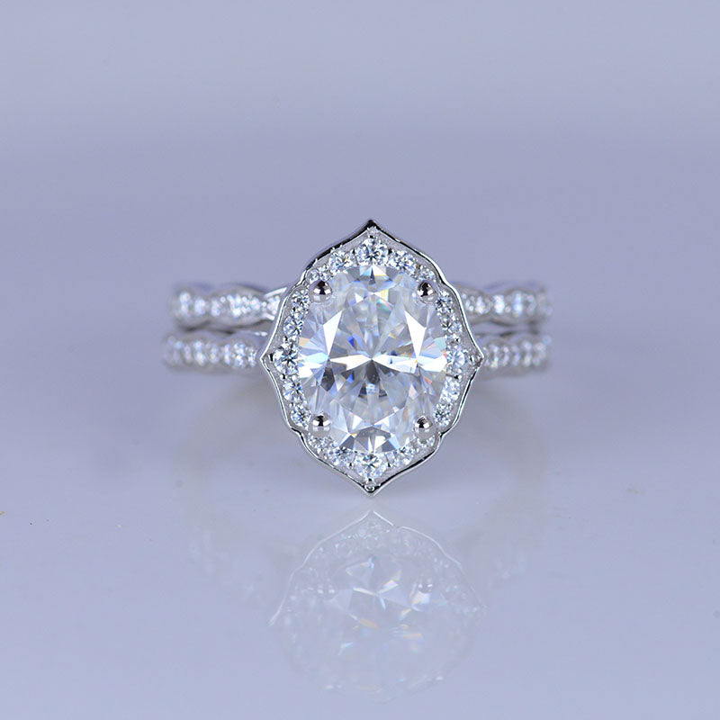 The default design option features 8x6mm Oval Giliarto Moissanite Center Stone D-Colorless, VVS1-Clarity, VG-Cut, Ex-Polish, VG-Symmetry