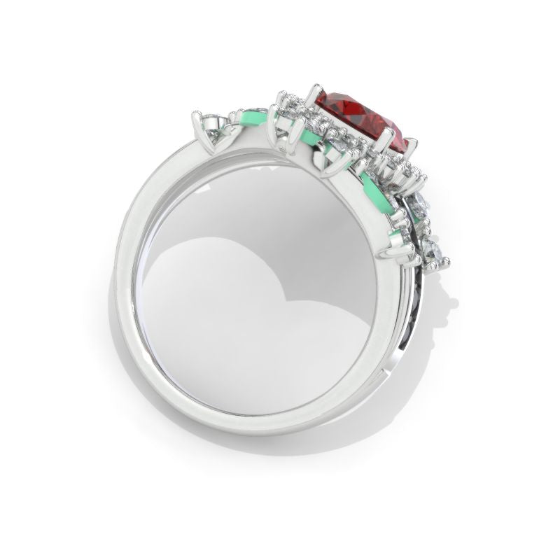 The default design option features 8x6mm Oval Cut Ethically Lab-Grown Ruby AAA+ Grade Stones, VG-Cut, Ex-Polish, VG-Symmetry Set with Black and Colorless Moissanite Accents in 14K White Gold Engagement Ring.