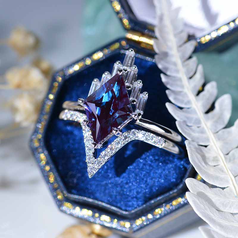 The default design option features 12x8mm Kite Center Ethically Lab-Grown Alexandrite Stones