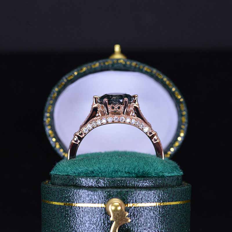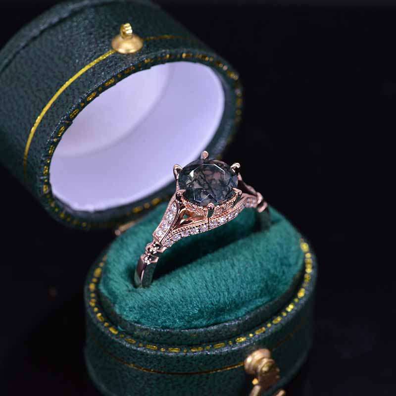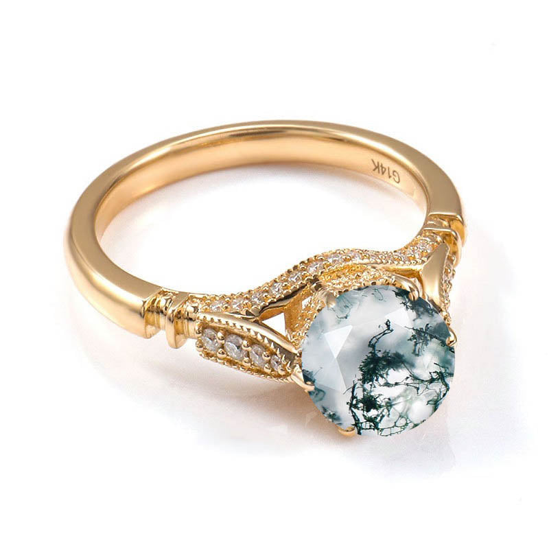 The default design option features 8 mm Round Genuine Moss Agate CenterStone, VG-Cut, Ex-Polish, VG-Symmetry Set with D-Colorless Moissanite Accents Stones