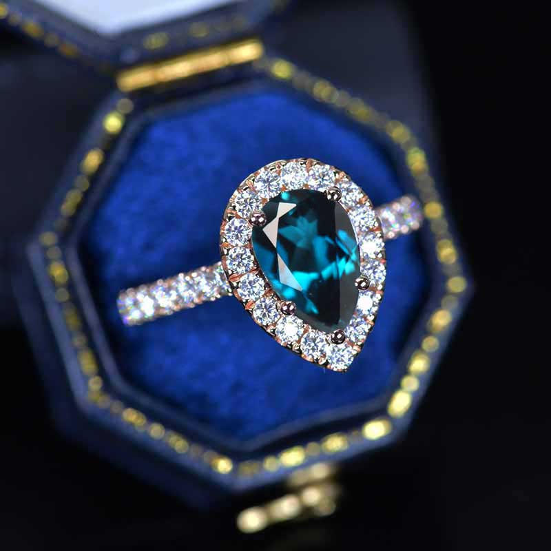 14K Solid Rose Gold 3 Carat Cornflower Sapphire Pear Cut Halo Moissanite Ring
