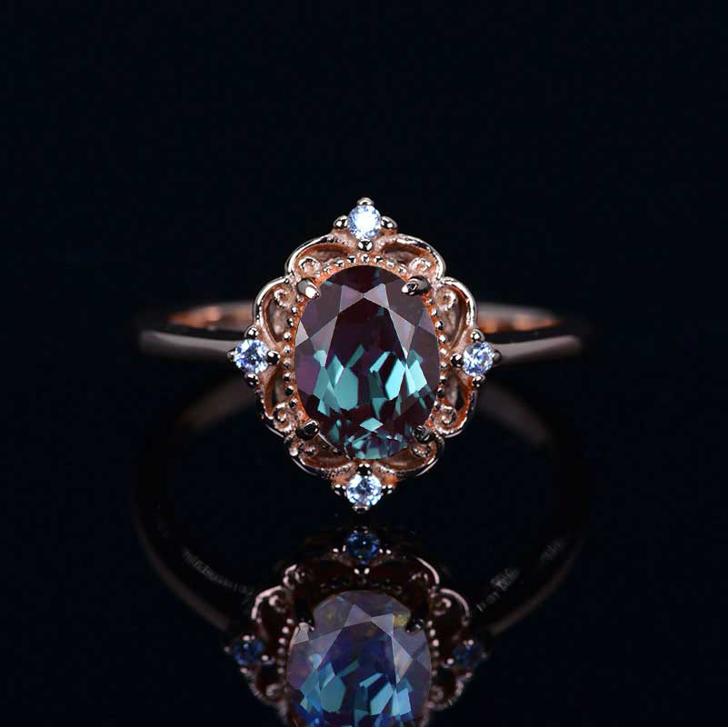 14K Solid Rose Gold Dainty Alexandrite Ring, 2ct Oval Cut Alexandrite Ring, Rose Gold Ring Unique Oval Halo Vintage Ring