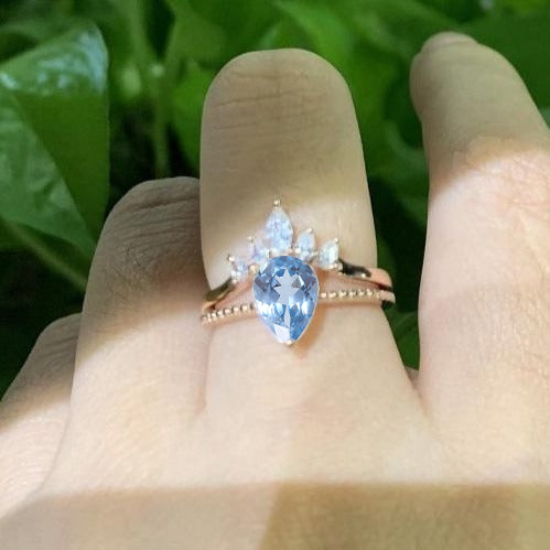 14K Solid Rose Gold Dainty Genuine Natural Aquamarine Ring Set, 3ct Pear Cut Genuine Natural Aquamarine Ring Set, Rose Gold Ring Unique Curved Marquise Cut Ring