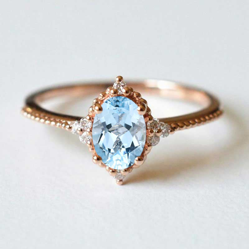 14K Solid Rose Gold Ring 2CT Oval Halo Natural Aquamarine Wedding Ring - Giliarto