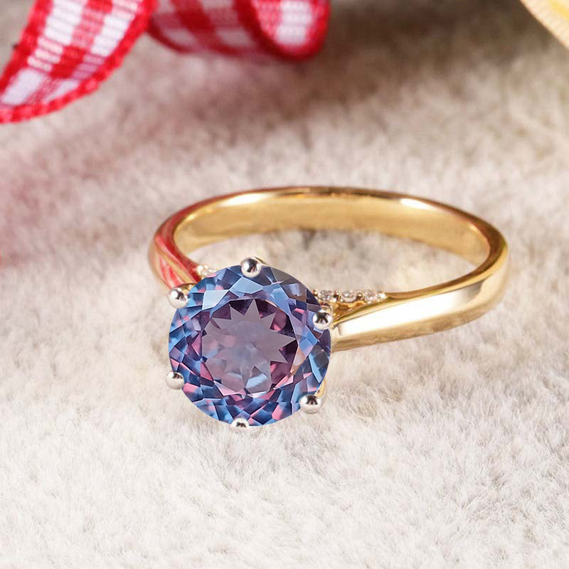 14K Solid Two Tone Gold 2CT Round Portuguese Cut Alexandrite Solitaire Six Prongs Ring Portuguese Cut Alexandrite Hidden Halo Engagement Ring Anniversary Promise Gold Ring