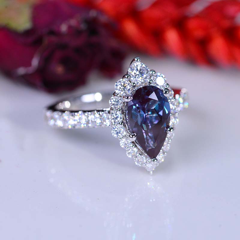 14K Solid White Gold 2 Carat Alexandrite Pear Cut Diamond Halo Engagement Ring Model 728