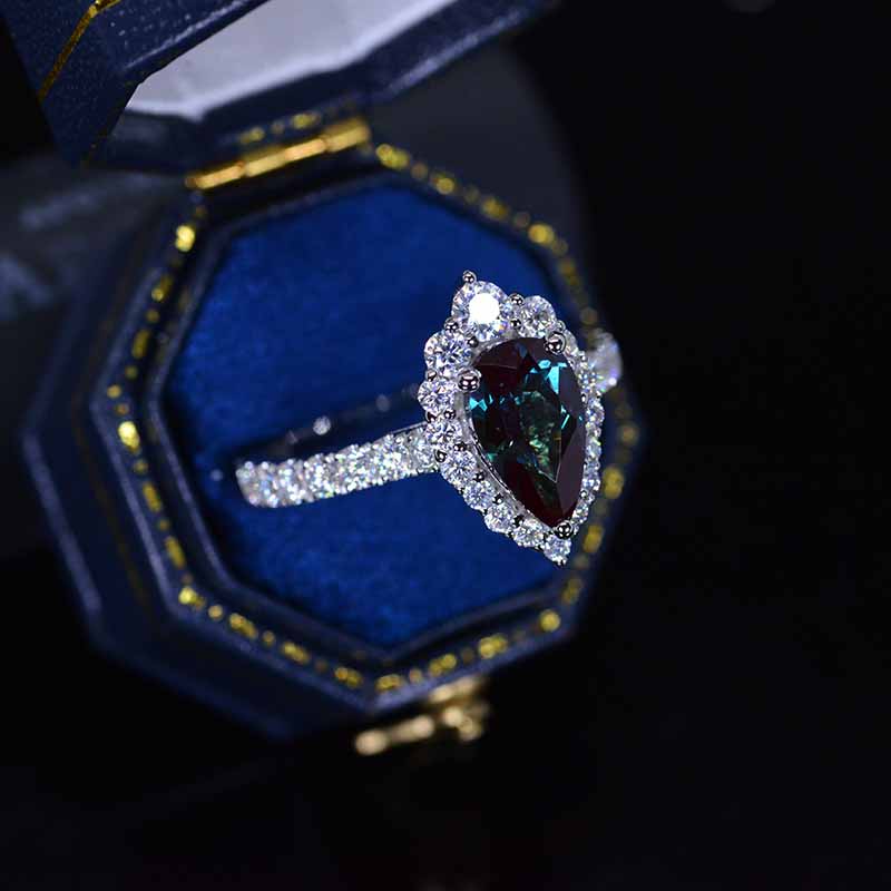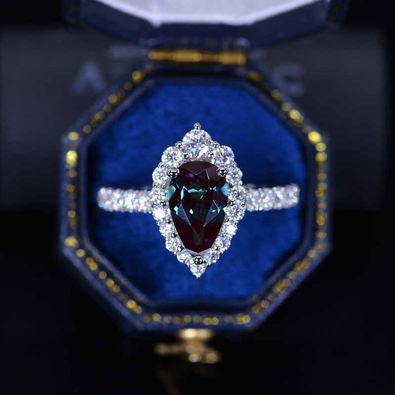 The default design option features 2 Carat 10x6mm Ethically Lab-Grown Pear Alexandrite Center Stone VVS1-Clarity, VG-Cut, Ex-Polish, VG-Symmetry set with 0.7 TCW D-Colorless Lab-Grown Accent Stones