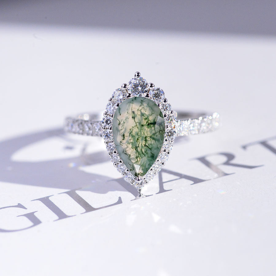 14K Solid White Gold 2 Carat Genuine Moss Agate Pear Cut Halo Engageme - Giliarto